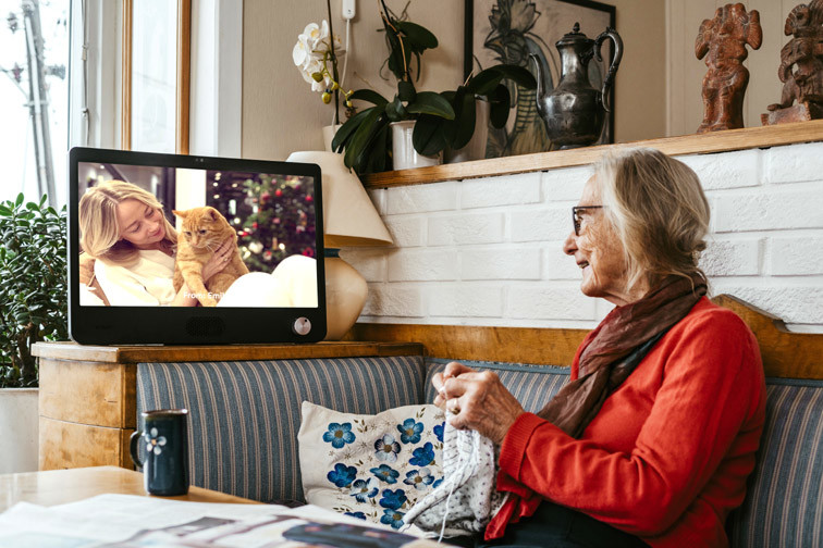 Komp ermöglicht es Kindern, Enkelkindern und Freunden, Erlebnisse einfach über Nachrichten, Fotos und Videotelefonate mit ihren Großeltern zu teilen.
